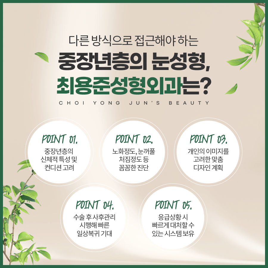 본원에서는 중년과 노인의 특성 그리고 성형을 잘 아는 성형외과 전문의 최용준 원장님께서 진료하고 계시는데요. 원장님께서는 오랜 임상경험과 지속적인 연구를 기반으로 환자분의 상태에 적절한 방향을 찾아드릴 수 있습니다. 특히 진단이 관건이라는 점을 잘 알고 계시기에 진단의 정확도를 높이기 위해 눈 상태는 물론이며 이목구비 전체의 조화, 현재 복용중인 약, 건강보조식품, 지병, 수술이력, 컨디션까지 꼼꼼하게 살피고 있는 만큼 부담적은 방식을 찾아 적용할 수 있으며 만족스러운 결과를 얻을 수 있습니다.